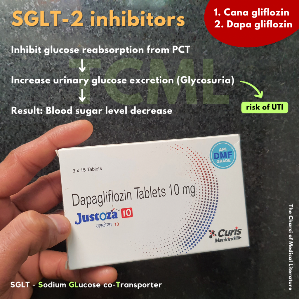 SGLUT-2 inhibitors: Act on kidney– Cana gliflozin– Dapa gliflozin 🌴 MOA-Block SGLU-2 in PCT → Decrease glucose reabsorption → more glucose excreted in urine, lowering blood sugar levels. 🟡 S/E- SGLT2 inhibitors make glucose pass into urine → urine becomes sugar-rich → bacteria grow easily → ↑ risk of UTI (and fungal infections). 🚨 SGLUT-2 […]