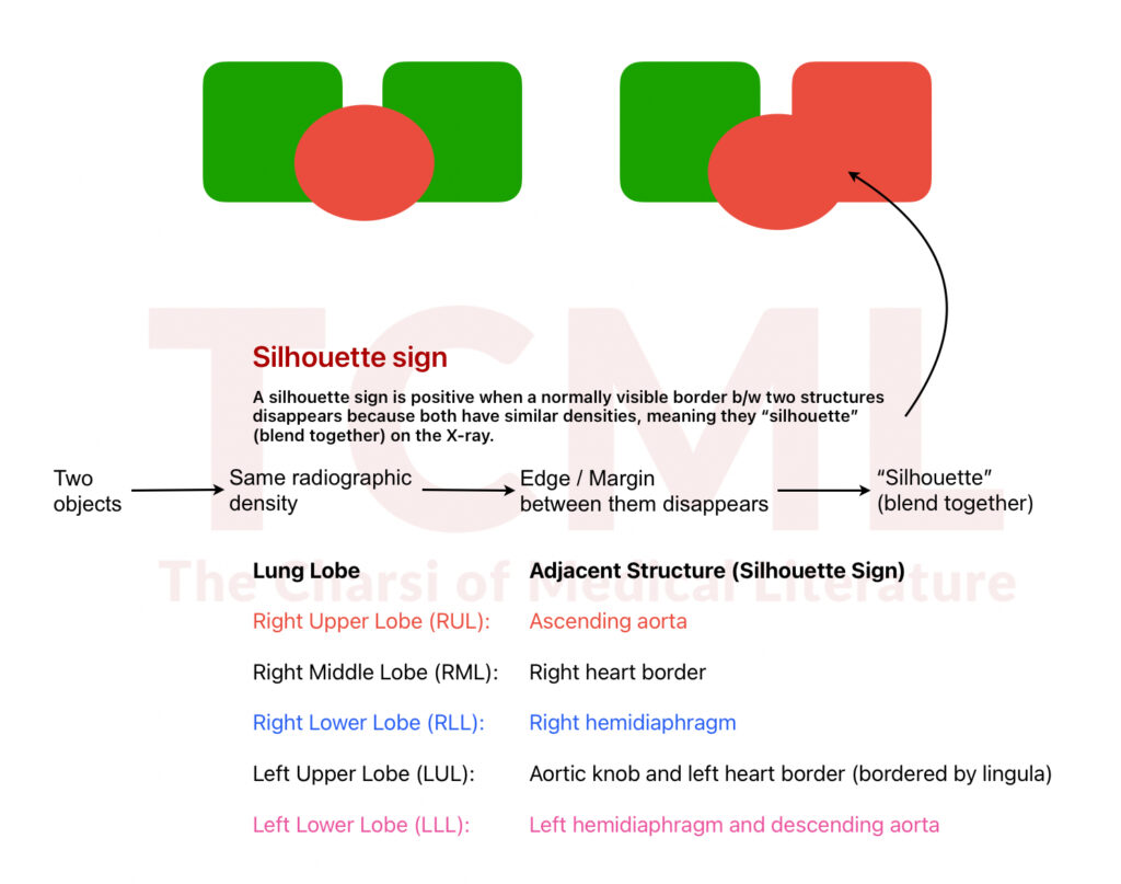 A silhouette sign is positive when a normally visible border b/w two structures disappears because both have similar densities, meaning they “silhouette” (blend together) on the X-ray.
